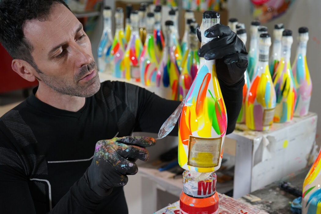 L’innovation est au rendez-vous avec la technique employée : pour la toute première fois sur une bouteille de vin, Raphaël Laventure a utilisé de la peinture acrylique appliquée au couteau. Cette méthode, signature de l’artiste sur ses toiles et sculptures, confère aux flacons une texture unique, une profondeur et une vivacité inattendues, transformant la bouteille en une pièce quasi sculpturale.